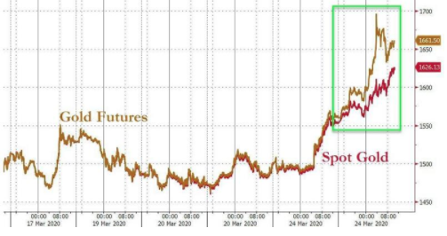 实物黄金的短缺令交易员们担心,黄金无法按时运抵纽约来交割期货合约,这也导致黄金期货价格大幅飙升,黄金期货和现货的价差一度飙升至每盎司70美元。