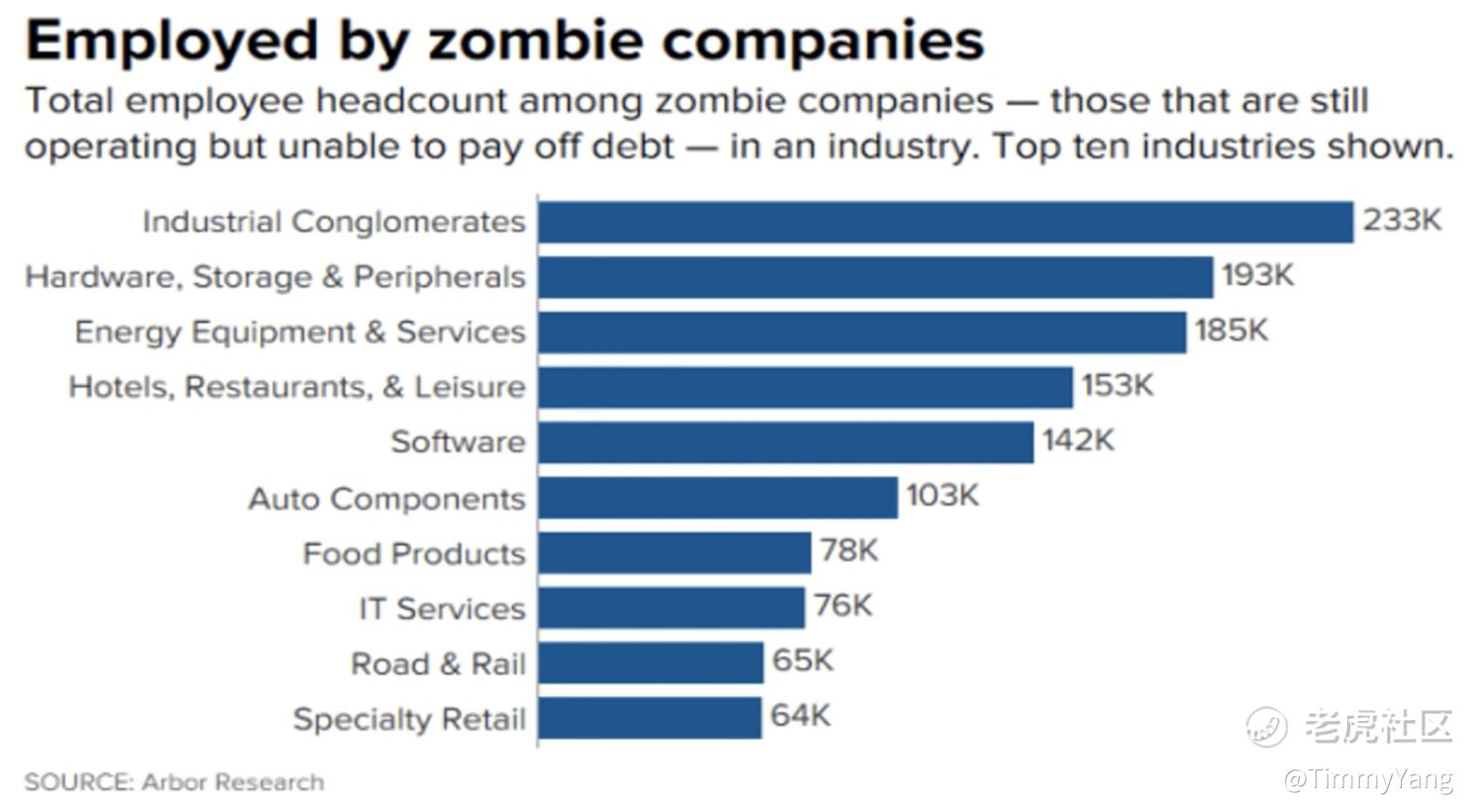 美国的公司是接近了20%,也就是说每5家公司里边就有一家公司是僵尸企业,其实就是资不抵债,这些僵尸企业里边大概有多少的就业岗位,分布在哪些行业,这个和大家的投资也是息息相关的。