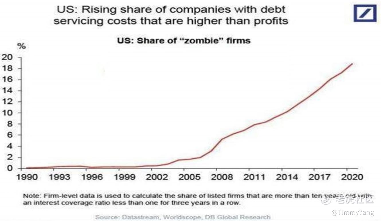 现在美国到底有多少的僵尸企业了?2020年6月份统计,德银的一份数据,研究的样本是目前已经是超过10年的公司,在过去的连续的三年,利润都不足以去支付利息,每年钱现金都在减少,所以它连续三年利润都不足以支付利息的公司叫称之为僵尸企业,这是德银的定义。
