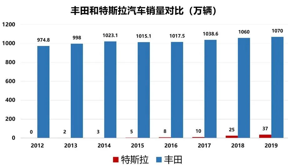 丰田2019年汽车销量为1070万辆,仅次于德国大众集团的1080万辆,而特斯拉2019年的销量为37万辆,只有丰田的20分之一都不到,如此悬殊的差距,为什么市场给了特斯拉如此高的估值呢?