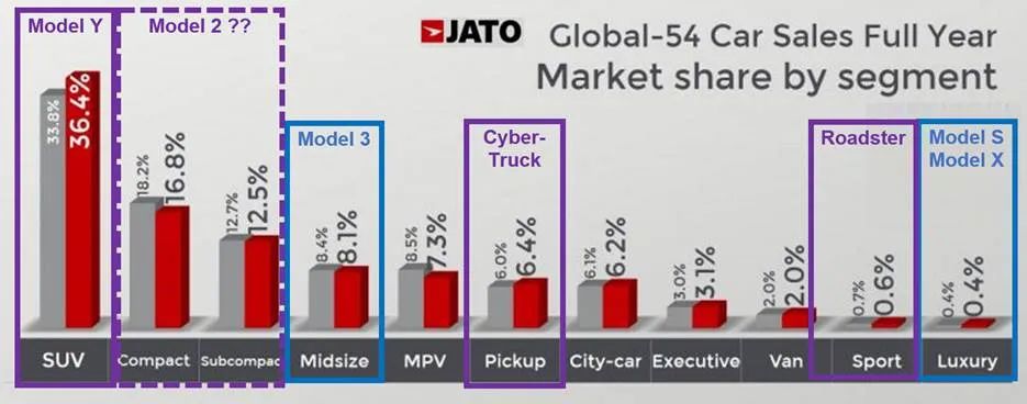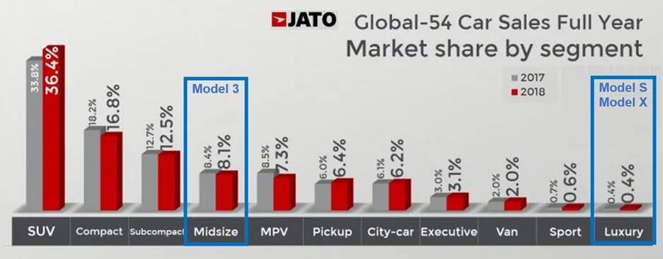 和丰田不同的是,目前特斯拉还处于发展的初期,量产的汽车包括高端汽车的Model S,Model X,中型轿车Model 3。根据JATO提供的全球汽车市场分类来看,高端轿车(0.4%)和中型轿车(8.1%)加起来只占到全球汽车销量的不到9%。
