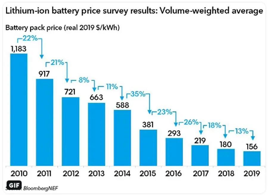拿Model 3 标准续航升级版54kWh的电池包来看,2010年的成本为45万人民币,而到了2019年只有不到6万元人民币了。