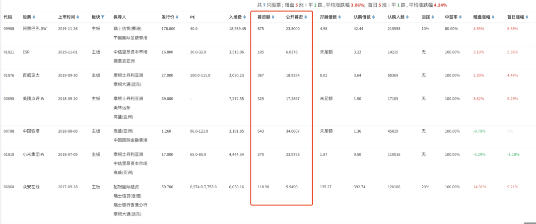 类似于这种超大市值的股票,初始的公开发售一般不会给到总募资额的10%,如果消息靠谱,网易先按中位数募资额120E左右计算,统计了17年之后的募资超百E的新股,表现如下: