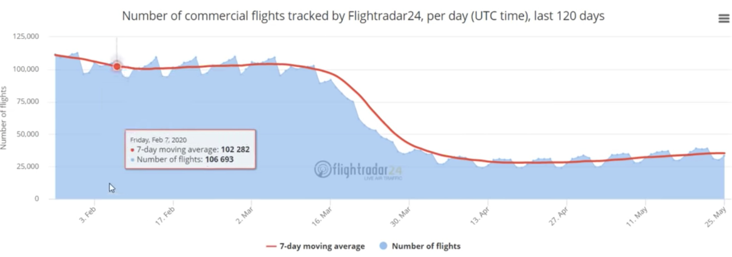从财报上来看,都能看得出来,随便拿出一个航空公司的财报,在2020年 Q1 是非常难看亏损的状态,在 Q2 季度财报也不会好看,目前在今天的涨幅仅仅是一个信心恢复而已。要从数据上去了解整体的状况,仅以航空业为例,整体飞行的数量,红色的是一个移动平均线,蓝色的是实际的数量,是不断向上攀升的,也就是说商业航班的飞行数量确实是在缓慢的复苏中。