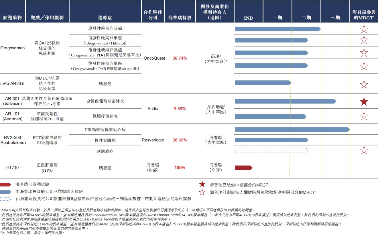 截至最后可行日期,海瑞普已经获得五项针对肿瘤及非肿瘤适应症的候选药物在大中华区的独家开发及商业化权利,其中两项处于III期全球临床试验阶段(即AR–301和RVX–208),两项处于II期全球试验阶段(即Oregovomab和AR–101)。海瑞普亦正开发一种由我们发现的专有肿瘤候选药物,目前处于临床前阶段。公司认为,凭藉生产、营销及分销依诺肝素的能力以及行业经验,能够顺利实现创新药管线的开发及商业化。