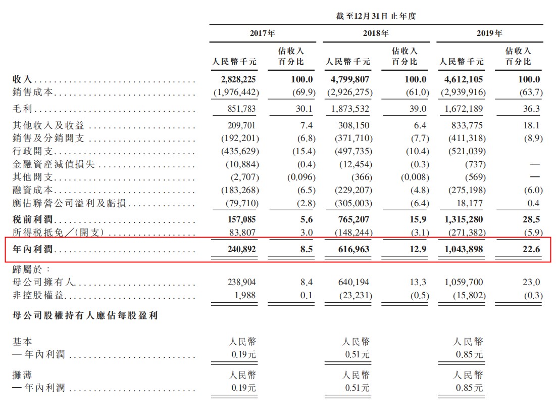 纯利从2017年的人民币240.9百万元增加156.1%至2018年的人民币617.0百万元,并进一步增加69.2%至2019年的人民币1,043.9百万元。