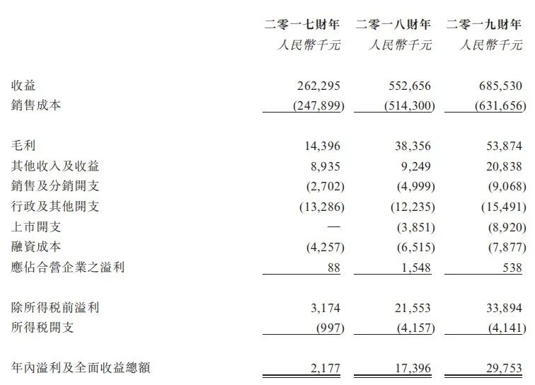 收益由2017财年的人民币262.3百万元大幅增加110.7%至2018财年的人民币552.7百万元。于2018财年及2019财年,收益由人民币552.7百万元增加24.0%至人民币685.5百万元。