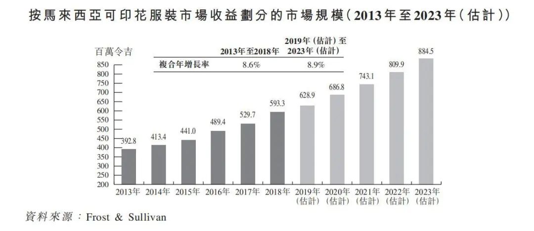 马来西亚可印花服装的收益呈增长趋势。成衣服装的收益亦由2013年的约275.0百万令吉增至2018年的约397.5百万令吉,复合年增长率约為7.7%。定制服装的收益 由 2013 年 的 约 117.8 百 万 令 吉 增 至 2018 年 的 约 195.8 百 万 令 吉 , 复 合 年 增 长 率 约 為10.7%。