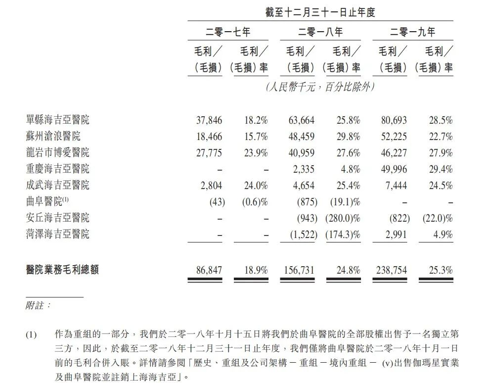 重庆海吉亚医院的毛利率由2018年的4 .8%显著上升至2019年的29 .4%,安丘海吉亚医院的毛损率由2018年的280 .0%显著下降至2019年的22 .0%,而菏泽海吉亚医院于2019年录得4 .9%的毛利率,2018年则录得毛损率174 .3%,主要由于该三家医院分别于2018年4月、2018年7月及2018年12月开始营运。新医院的收入通常较低,营运成本较高,因此在营运初期可能录得毛损率或相对较低的毛利率。
