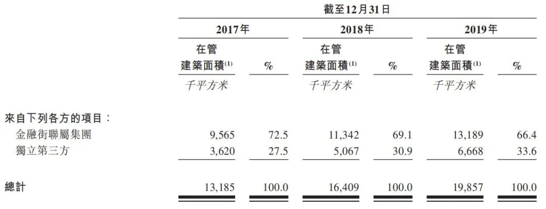 在管建筑面积亦由截至2017年12月31日的约13.2百万平方米增至截至2018年12月31日的约16.4百万平方米,并进一步增至截至2019年12月31日的约19.9百万平方米。独立第三方项目的在管建筑面积由截至2017年12月31日的约3.6百万平方米增加至截至2018年12月31日的约5.1百万平方米,并进一步增加至截至2019年12月31日的约6.7百万平方米,分别佔截至相应日期在管总建筑面积的27.5%、30.9%及33.6%。