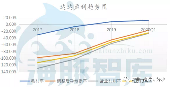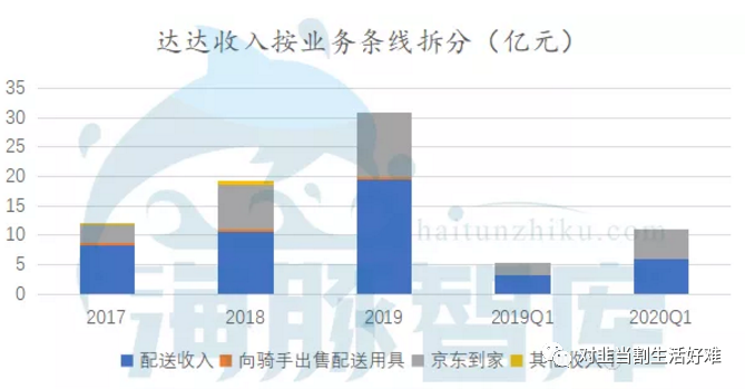 2019年,达达的收入为31.0亿元,同比增长了61.3%。2020年一季度的收入为11.0亿元,同比增长了108.9%。其中,今年一季度的增速非常快,与新冠疫情期间人们更多的在线下单购买超市商品有关。