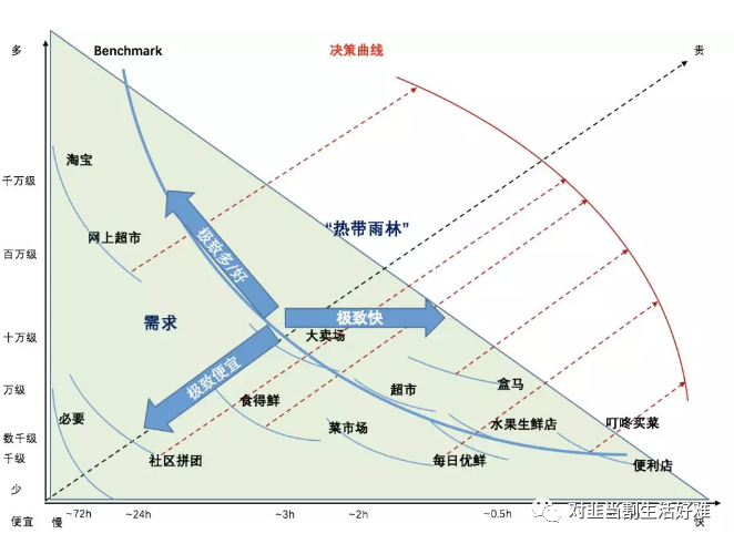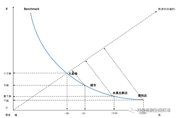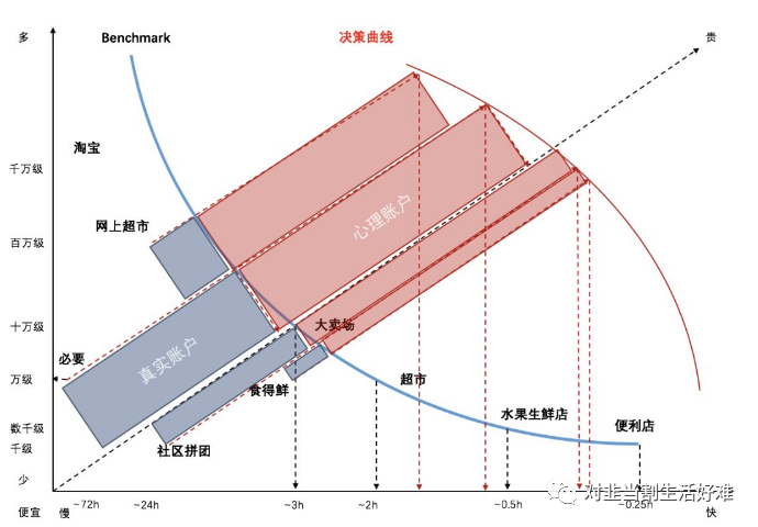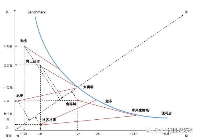 同时,当你在线下购物的时候,你的决策就是所见及所购,是即时决策;当你在线上的时候,你不用出门,于是你心理就会对客单价有溢价预期,配送时间越快、SKU越多,你心理能承受的溢价就越高——由此,才有了众多新零售创新商业模式公司共存的可能性。