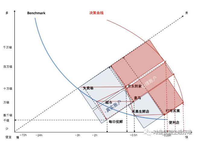 京东到家是叠加在传统业态上粗暴的“金钱换时间”的模式,最为简单粗暴,赚的就是你懒得去超市,店到家的钱;盒马,店仓结合模式实现了超市级的店面+半小时级到家服务+餐饮的混合业态。消费同样需要为此提前消费付出溢价,理论上来讲仓比店实现到家的综合成本更低;叮咚买菜,完全的“即时决策、即时消费”,进而实现最高的效率,用户需要为丰富的SKU以及最短的消费时间付出最高溢价。