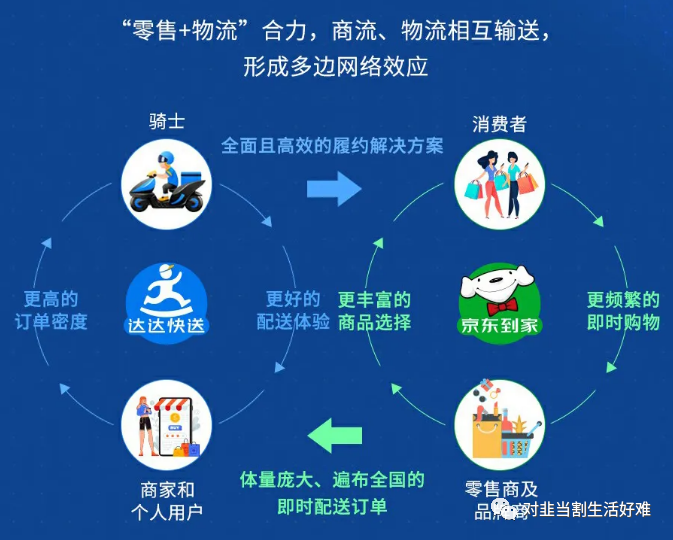 达达集团是由达达快送并购京东到家最终形成的,京东到家的业务拓展为达达快送输送更多配送需求,订单量和订单密度越大,越能放大达达的网络效应,进而吸引更多骑士加入,充沛平台运力,优化履约体验;达达快送履约体验的提升,会加快线下商家的商品流通,也能为消费者提供更好的服务,进而促成京东到家吸引更多零售商和品牌商加入,消费者可购买更多品类、更加优质的商品,增加用户下单意愿和黏性,形成规模扩大、订单增多的结果。