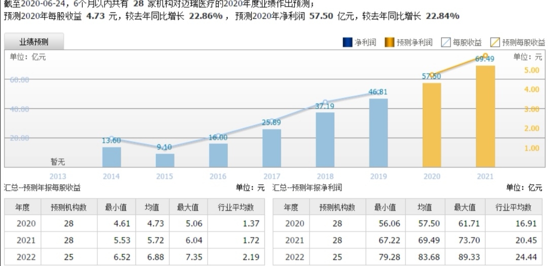 其次,公司具备较高的成长性。短期来看,公司用于新冠疫情所需的呼吸机等医疗设备,在上半年出货量大幅增长,预计下半年仍然保持高增长。中长期来看,根据券商机构给出的公司盈利预测平均值,预计迈瑞医疗2020年、2021年净利润分别为57.5亿和69.49亿。