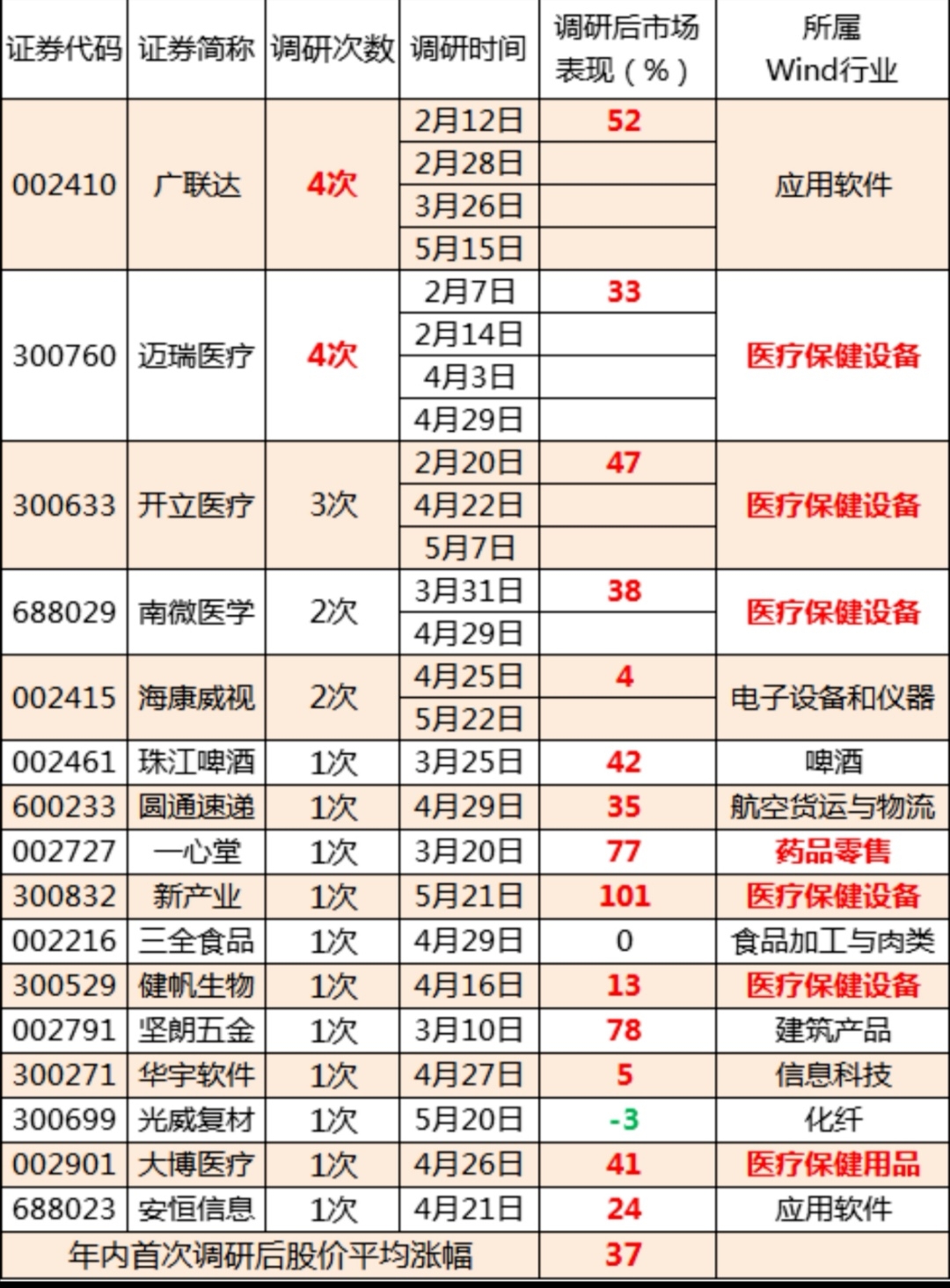 从调研时间来看,高瓴资本最近一次(5月22日)调研海康威视后,至今暂未调研其他A股公司。从获得高瓴调研次数来看,2020年至今获得高瓴调研的16家A股公司中,有5家公司被高瓴多次调研。其中年内最受高瓴资本关注的是广联达和迈瑞医疗,二者获得高瓴调研的次数均达到4次。