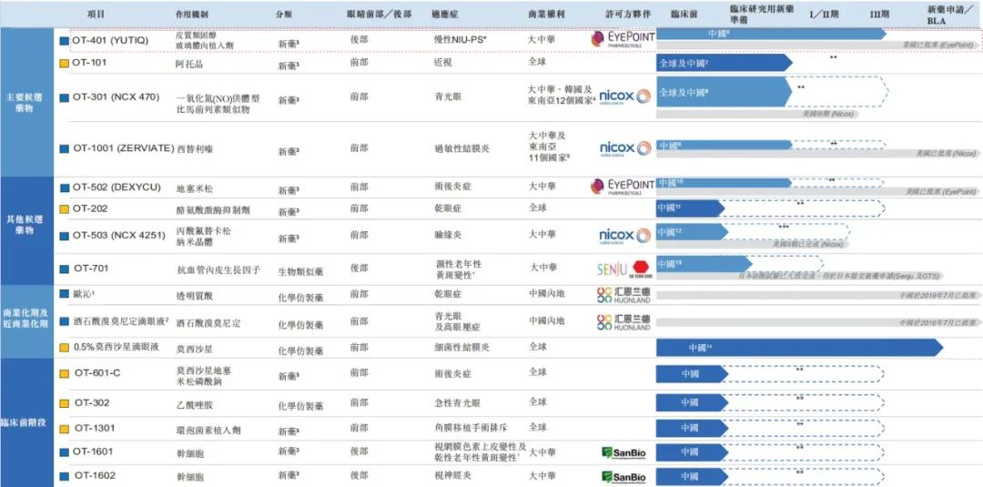 欧康维视共有16种药物资产,涵盖所有主要的眼睛前部及后部疾病。其中,处于后期及临近后期的项目共4个,近临床期项目4个,商业化期及近商业化期项目3个,临床前期项目为5个。