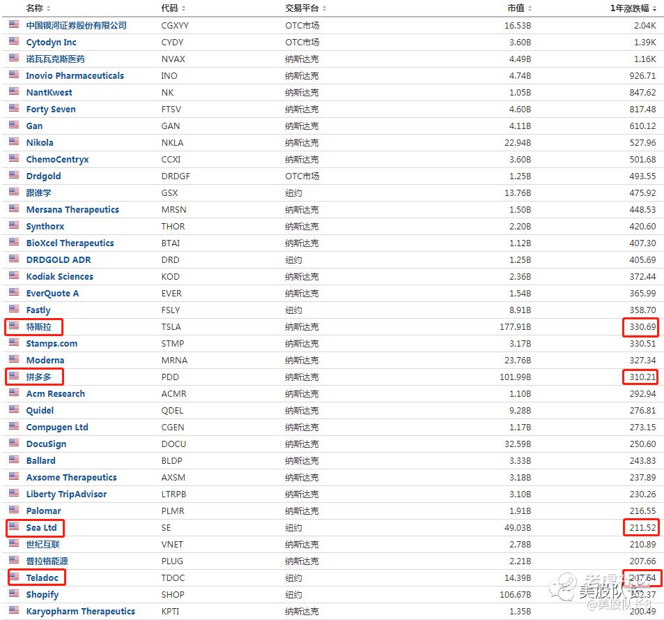 上图是过去一年在美股市场涨幅超过200%的10亿美金以上的公司,除去otc市场一共是33家。