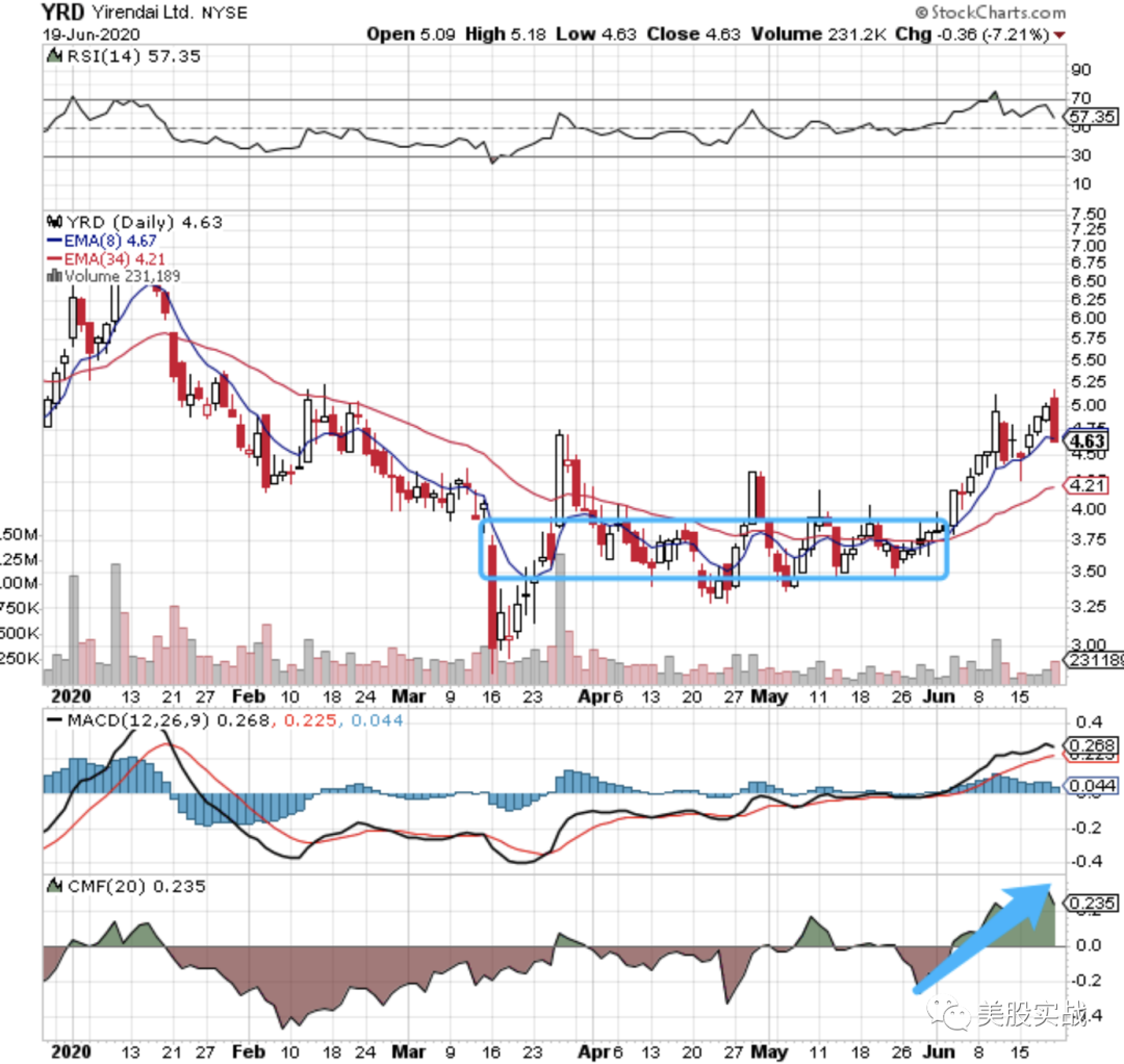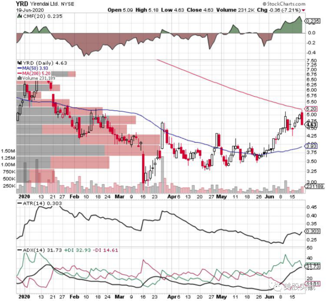 $YRD 在技术面上比较好看,三个月左右的磨底,目前是明显的突破向上趋势。近期来说有一定的超买情绪,图形上是一个小双顶,但是底部扎实,CMF也由负转正,因此还有很大的向上空间,简单来说$4.2以上都可以继续看涨。虽然说2C借贷(P2P)的风头已过,目前的市场行情中概股集体上扬,$YRD 有足够的理由在这一波行情中继续冲高。
