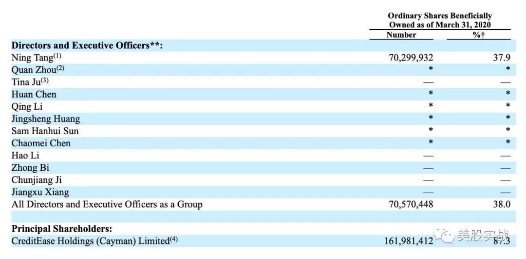 股权结构方面,以宜人金科截至2020年3月31日已发行的185,613,004股普通股计算,执行董事长兼CEO唐宁持股比例为37.9%。唐宁并非直接持有上述股份,他通过名下一家信托公司持有英属维尔京群岛一家公司的全部股权,而后者又持有宜人金科母公司宜信控股37.9%的流通股。高管及董事总持股比例为38%。宜信控股(开曼)有限公司为宜人金科最大股东,持股比例高达87.3%。该公司的所有人为唐宁及包括IDG、KPCB中国和摩根士丹利私人股本亚洲在内的一些投资人。