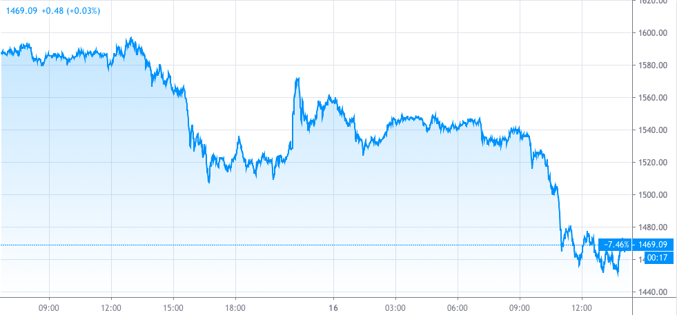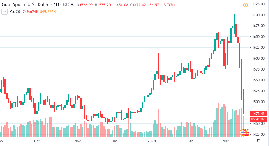 黄金市场本周一(3月16日)再次经历暴跌。在美联储宣布降息和QE后,现货黄金价格一度涨至1570美元/盎司上方,但此后大幅回落,刷新三个多月新低至1451美元/盎司,日内跌近4%,从高位更是跌去了120美元。