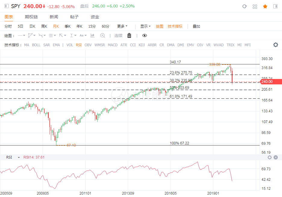 2、从技术面来看,这波下跌标普也到了关键点位2350,用黄金分割线来测量2008年以来的牛市,2350刚好是这波牛市回撤38.2%的关键位置,如果跌破,股指可能就直奔2000点的50%回测位置了。具体如下图: