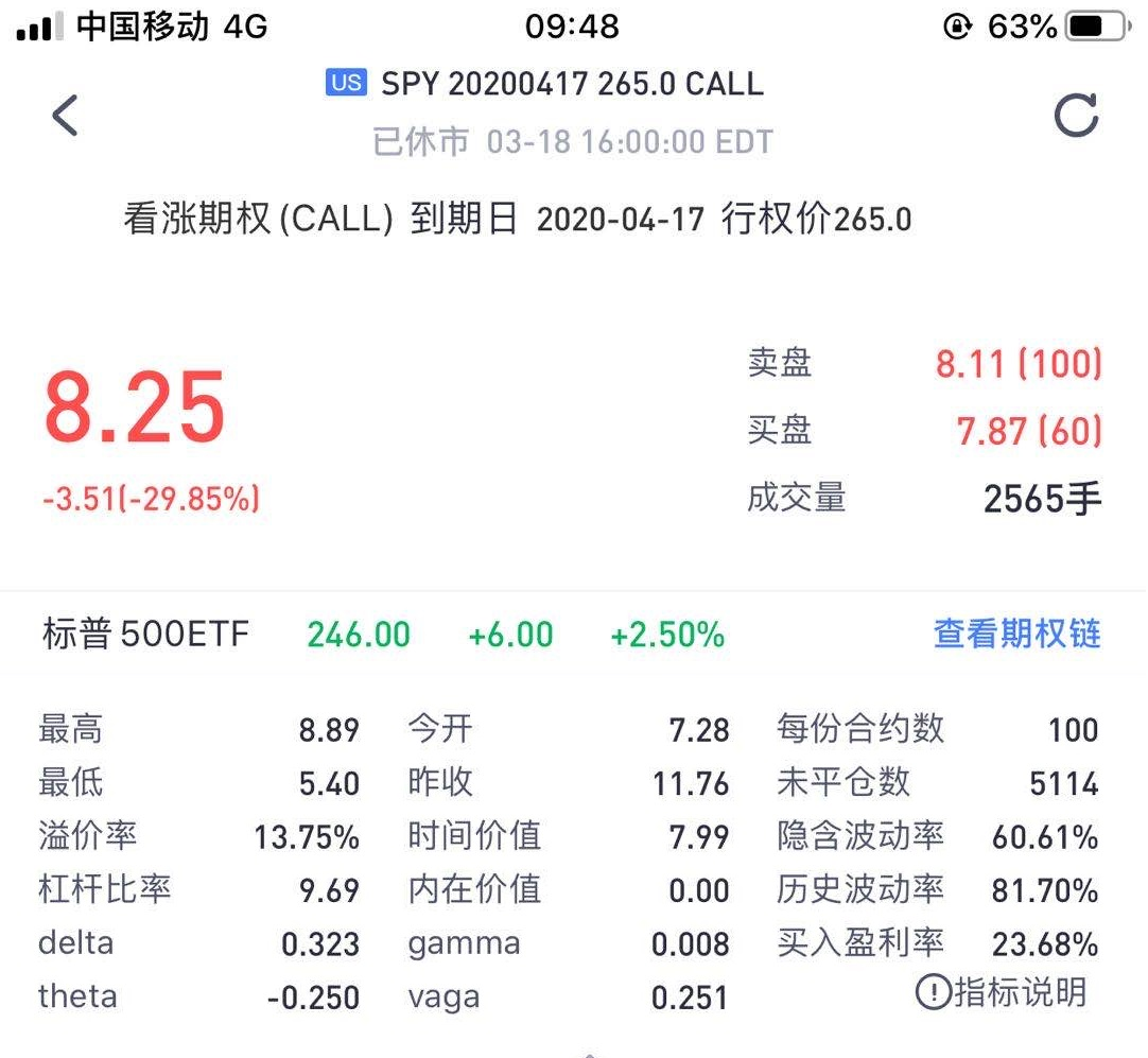 2、我打算今天晚上卖掉6手2020年4月17日到期的看涨期权,行权价265美元,期权市场价为8.25美元。