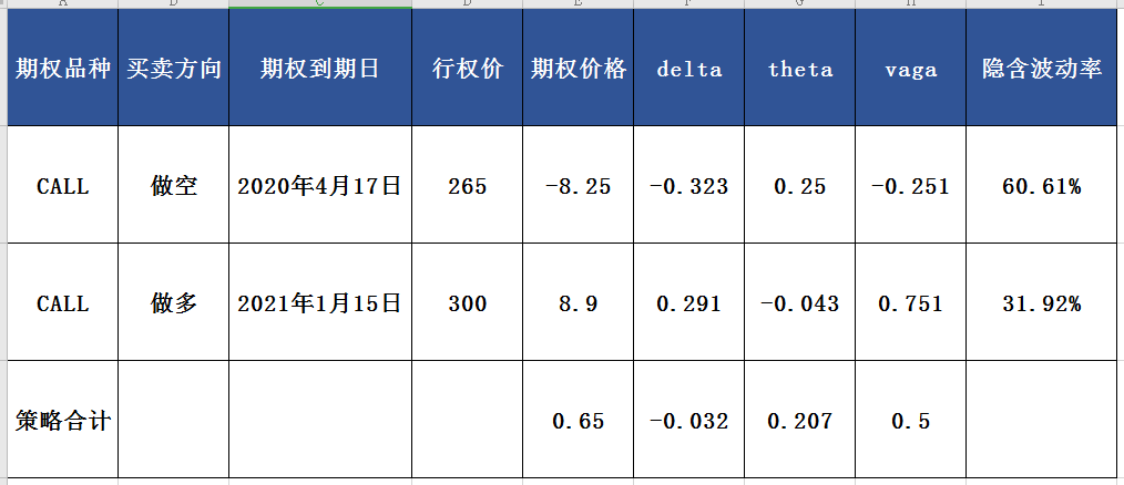 2、这个策略在delta上净看空,但看空的程度不高,在theta上净看多,在vaga上净看多。用大白话来说就是,如果股票下跌,我会赚钱;随着时间的流逝,我会赚钱;如果波动率上涨,我也会赚钱。即看空股票、做空时间,做多波动率。