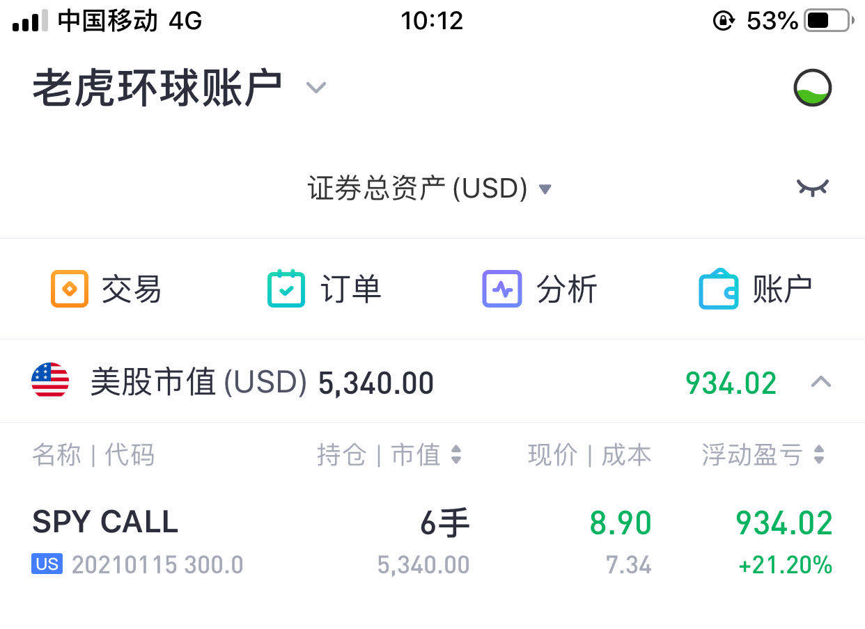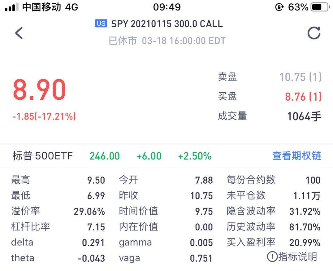 1、我现在手上有6手2021年1月到期的看涨期权,行权价300美元,期权市场价为8.9美元;