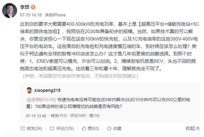 “是否会坚持增程式路线,这是理想汽车的投资者不能忽视的问题。”