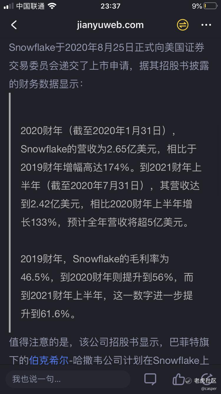 冷静对比 ,对比甲骨文390多亿收入,估值1900亿,snow收入只有3亿,只有甲骨文的不到1% ,那估值应该在200亿 才对现在 240价格的话估值600亿了