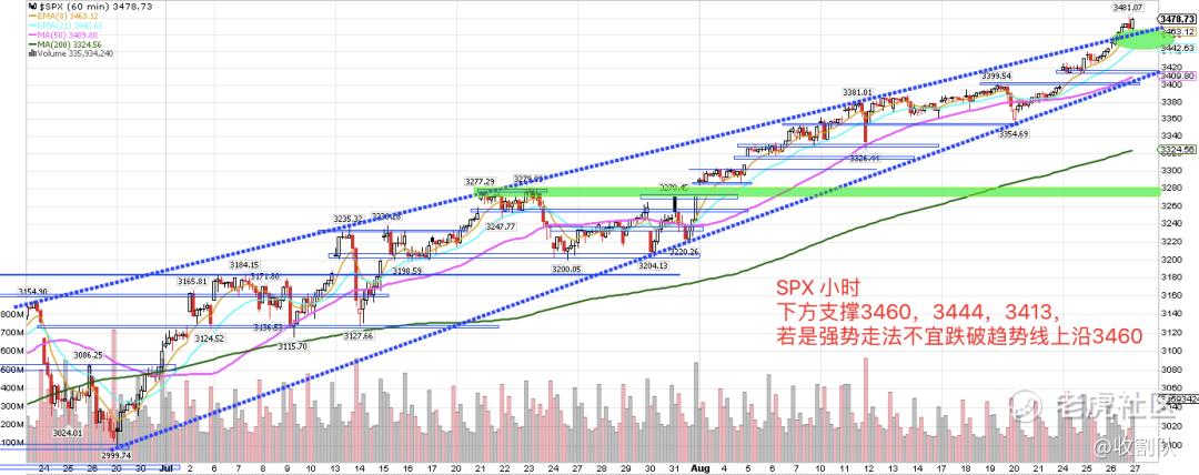 SPX跟随纳指步伐突破趋势通道,开启加速上涨模式,最高达到3480,日线进入超买区间(注意超买不一定代表会跌,超买可以持续超买)。SPX下方支撑3460,3444,3413,若是强势走法不宜跌破趋势线上沿3460。