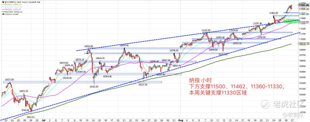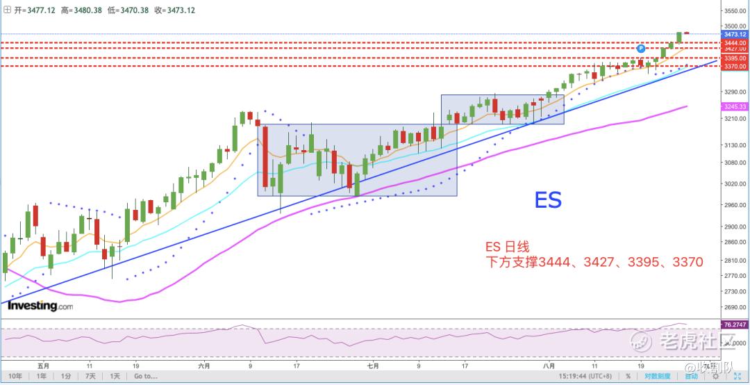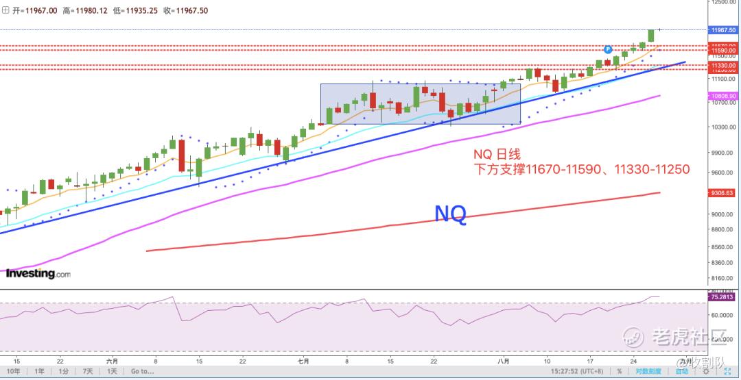 纳指日线开始进入超买区间,下方支撑11500、11462、11360-11330,本周关键支撑11330区域。纳指100指数期货NQ下方支撑11670-11590、11330-11250。科技股中软件股领涨,其次动能股也大涨,半导体微涨。FAANMG均涨,FB及NFLX领涨。
