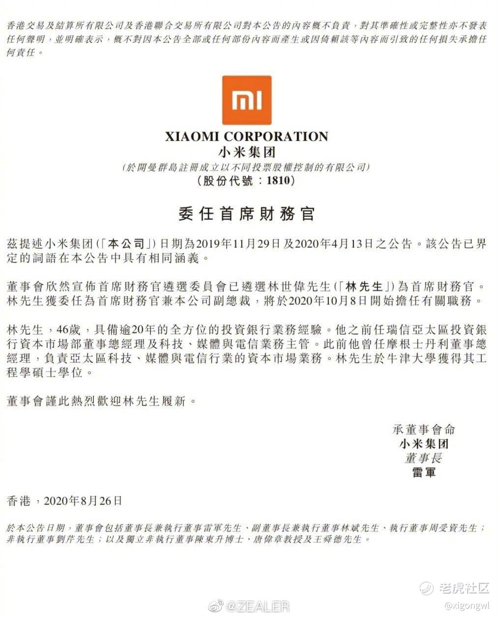 小米集团昨天发布公告称,董事会宣布首席财务官遴选委员会已遴选林世伟为首席财务官,将于2020年10月8日开始担任有关职务。