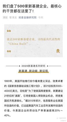 8月26日,经济学家管清友及其创办的如是金融研究院,重磅发布一份题为《新基建,新动能,新征程》的报告。报告梳理了新基建七大产业链中约500家企业的参与情况,并重点分析了其中10家核心代表企业,包括华为、阿里、腾讯、$联想集团(00992)$ 、宁德时代(194.40 -2.76%,诊股)、京东方等,10家企业共同构成“China Built”,代表推动新基建落地的企业力量。报告同时指出,在国内国际“双循环”格局下,以新基建为基础的数字经济,是中国经济从“China Made”向“China Built”换道超车的秘密武器。