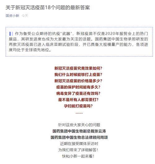 国药中国生物总法律顾问周颂介绍,国内新冠灭活疫苗获批临床试验的有三支,国药中国生物就占了其中的两支。目前也是紧急使用接种量最大的、人数最多的,打了数十万人次,无一例明显不良反应,无一人感染。
