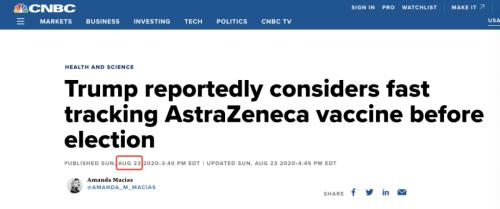 此前,美国消费者新闻与商业频道(CNBC)在一篇报道中称,特朗普政府曾考虑在大选日之前,对阿斯利康这支疫苗进行紧急使用授权,以便能够在美国使用。