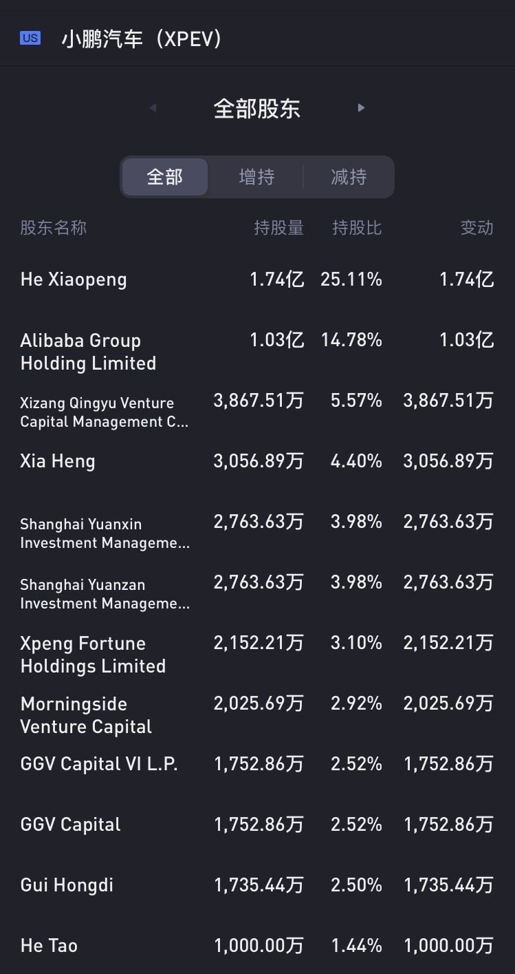 IPO后,小鹏汽车董事长、CEO何小鹏持股为25.11%,为最大的股东。阿里巴巴持股为14.78%,为第二大股东。