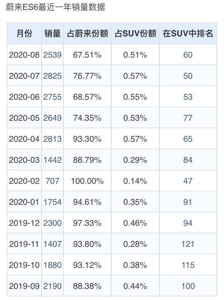 2020年8月,蔚来ES6销量同比增长8.69%,环比下降10.12%;最近12个月中,蔚来ES6销量在2020年7月达到最高,销量为2825辆。