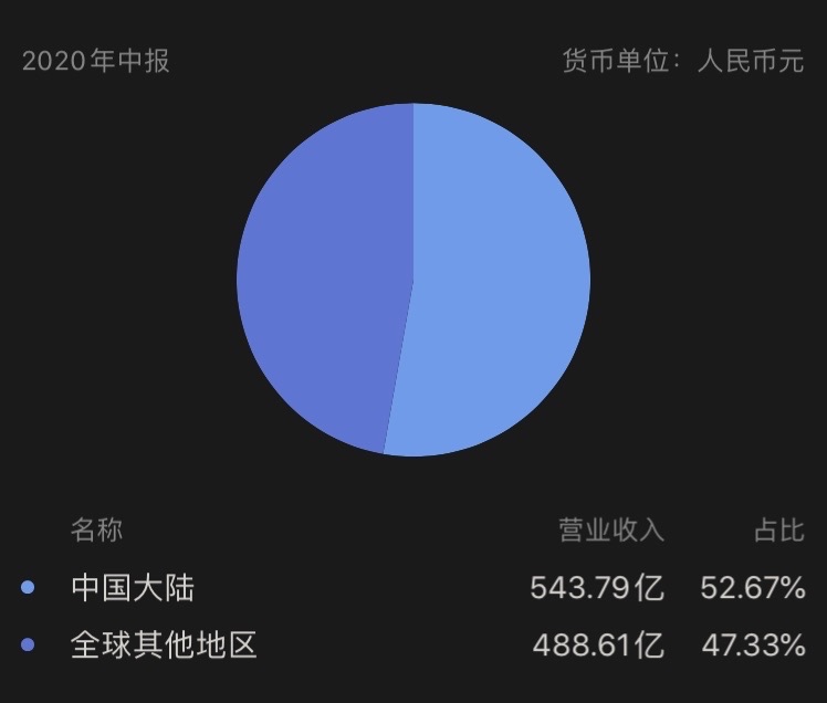 2020年年中财报,中国大陆以外的地区的销售占比47.33%。小米已经进入全球90多个国家和地区,有50个市场是排名前5,25个市场是排名前三。