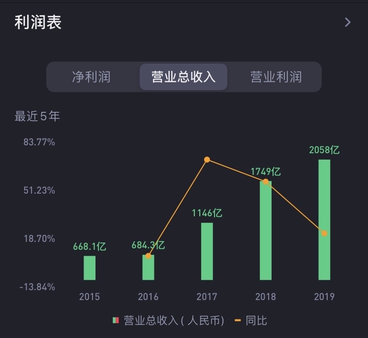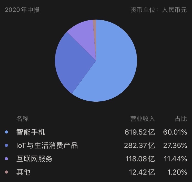 2020年上半年,小米的手机销售占比仅占起总营收的60%,中国大陆以外的地区的销售占比47.33%。小米非手机业务和全球化业务做得相当出色。即便小米没有手机业务,也是一个年销售额过400亿人民币的公司。2019年小米总营收已经突破2058亿人民币,净利润100.4亿人民币。净利润虽然不太稳定,但是营收一直是高速增长状态,截止2020年10月5日,市值不到5000亿港币。