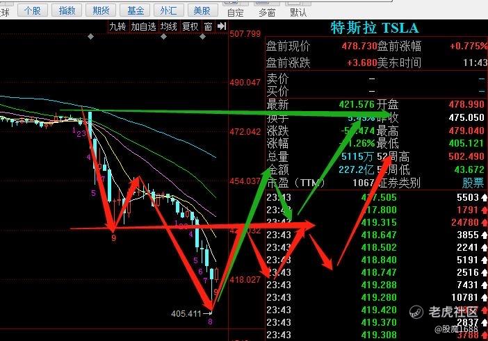 $特斯拉(TSLA)$目前看是这样的两种走势:第一种是做到436.221回踩405附近,然后再上436再来一笔下跌确认,直接上436压力点在454.990 。第二种是 直接上454.990然后回踩436.221再上454,两种走势是不破405的情况下……闲着没事判断这一下美股特斯拉走势……纯属娱乐