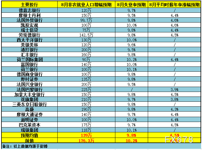 摩根士丹利(Morgan Stanley)在内的25家大型投行预测显示,各投行对非农就业人口增幅的预期较7月略有下降,具体而言,美国8月季调后非农就业人口增幅料介于75万至225万,失业率料介于9.5%-10.2%,平均时薪年率增幅料介于3.8%-4.6%。下图为各家投行对于非农数据的具体预测。