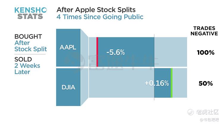 根据对冲基金交易信息平台Kensho的数据,苹果历史上4次拆股后的2周内,股价皆出现下跌(100%),平均下跌5.6%,