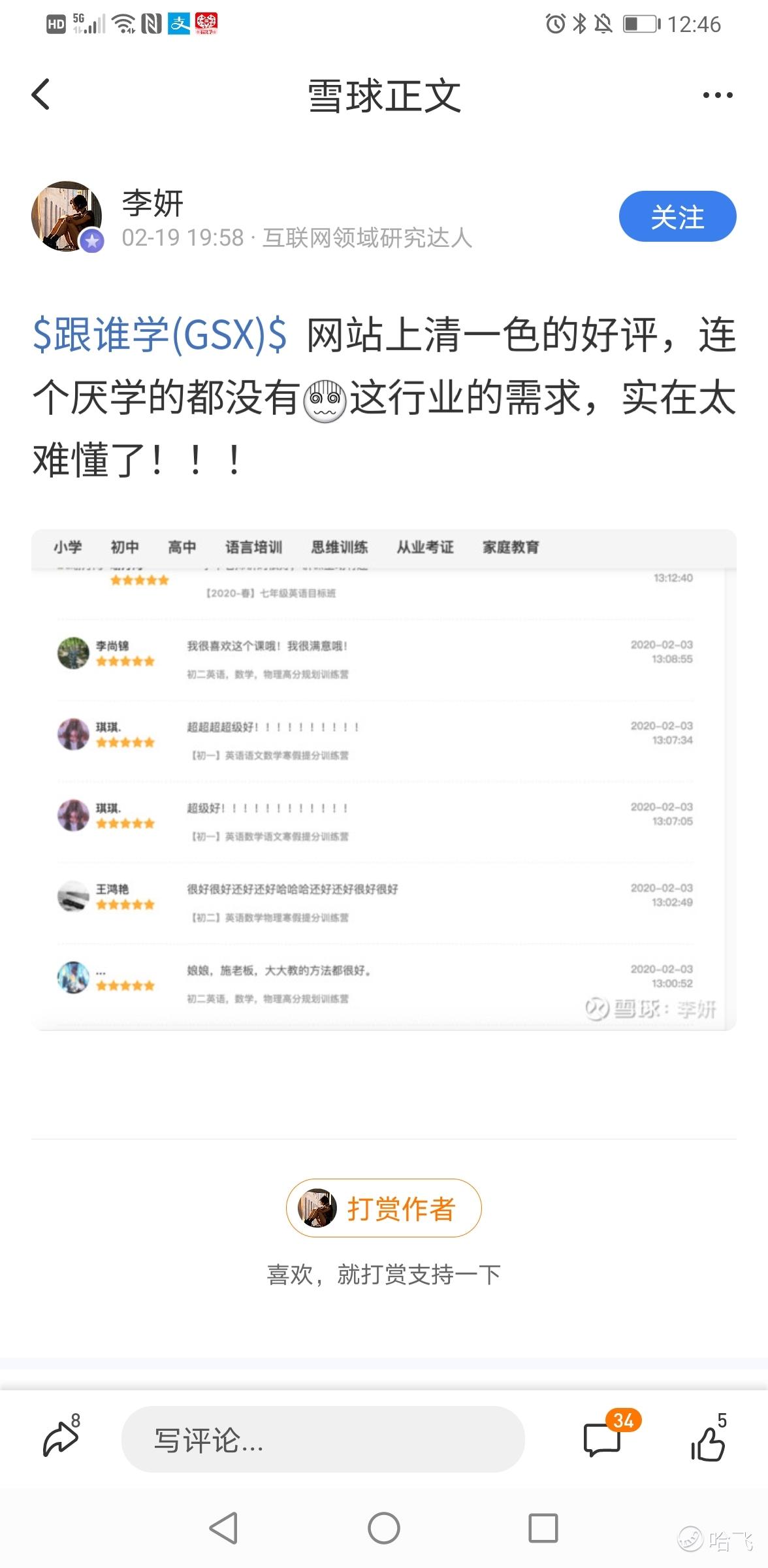$跟谁学(GSX)$ 弄虚作假已经成为这家公司的企业文化…app下载量和评论靠刷,财报数据靠造,股价靠庄,一个彻头彻尾的骗子企业。上市半年股价翻了五倍的情况下,还说要回购股票,然后创始人把一半股票质押给银行套现,然后这么优秀的百亿美元公司高管纷纷离职。这家公司就是靠大股东玩资本游戏割韭菜,我给大家的投资建议是短期做多当天交易赚傻庄的钱,因为庄家希望通过拉高股价回击做空和质疑,长期往死里空。这种靠包装的公司就怕牛逼吹大了,一旦被盯上,扯下画皮,彻底完蛋。一年后再看,十亿美元以下。
