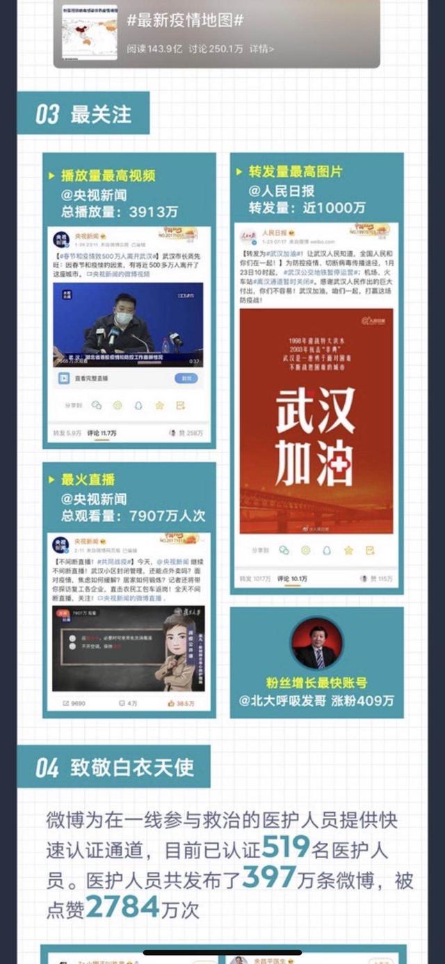 兼具内容和互动,独特的社交媒体产品。我们拿此次新冠肺炎来说,微博上的内容和互动讨论,可以说全网最多。头部的重要媒体,每天都在微博发布大量的疫情、健康、防护等内容。比如央视新闻、新华视点、人民日报等。说三个数据:@央视新闻的一条最高播放量视频,总播放量3913万次。@人民日报的转发量最高图片微博,总转发量近1000万。@央视新闻最火的一条微博直播,总观看人数7907万人次。