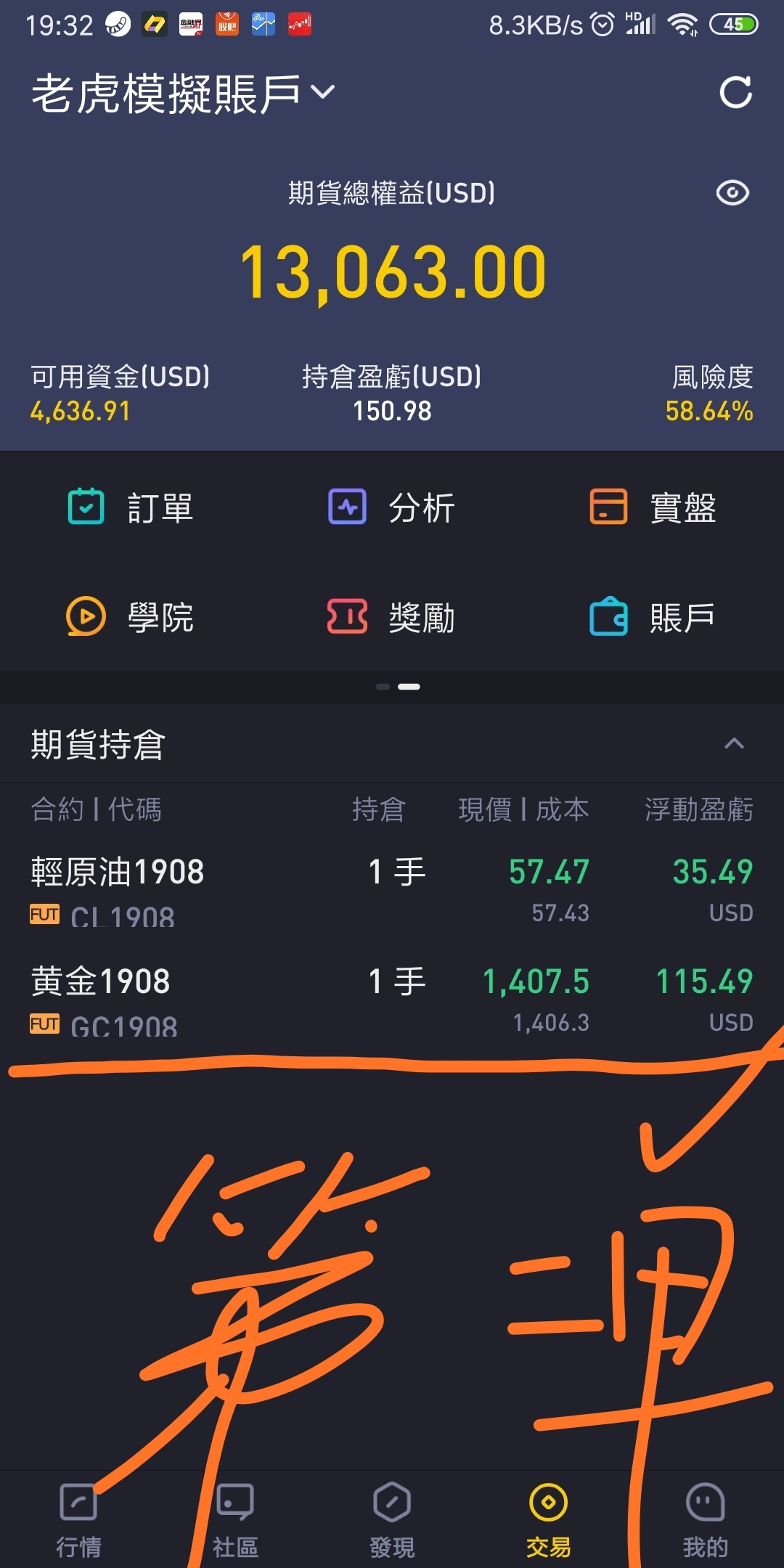 我也是模拟盘。第一单已止盈,第二单目前持仓 [开心]