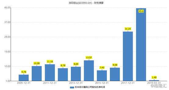 另外,据业绩快报显示,2019年二季度公司营业收入45.37亿元,同比增长8.15%,归母净利润为2.72亿元,同比增长83.43%,随着钼价格不断上涨,公司盈利水平将进一步得到改善。