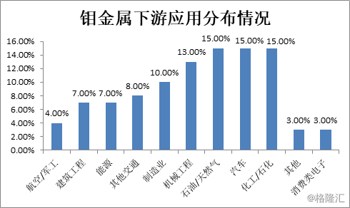 从需求端看,下游需求坚挺。钼在现代工业中应用广泛,按直接应用来分,超八成钼用于制造合金钢、不锈钢及其他合金,13%制成钼酸铵、钼酸钠、有机钼等,用于化工领域,其余5%制成钼丝等钼金属,用于灯泡制造、电子管和集成电路等电子工业、模具制造、高温原件、航空航天及核工业等高精尖领域。从终端消费看,钼金属应用于现代工业的方方面面。