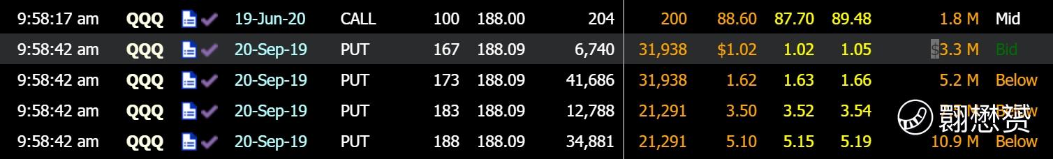 9点58分42秒成交了四单,这四单是同一笔交易!很明显这还是一个看涨策略!$纳指ETF(QQQ)$